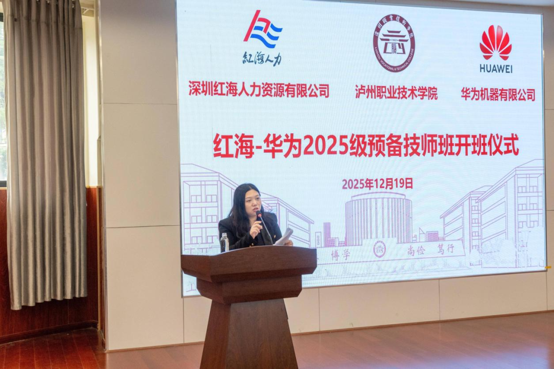 2025年12月19日,泸州职业技术学院、深圳红海人力资源有限公司、华为机器有限公司红海-华为2025级预备技师班开班仪式在泸州职业技术学院萧秋厅举行。
