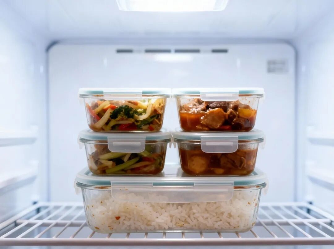 熟食趁热分装 菜出锅1小时内,按单人份装入玻璃/陶瓷保鲜盒,不要用塑料外卖盒。 冷藏时要密封 密封好并趁热放入冰箱即可,无需等待冷却。这样做的目的是在细菌大量繁殖之前,尽快把温度降到4℃以下,减少细菌快速繁殖的时间。 图源:AI生成 小提醒:密封食物如果使用保鲜膜,最好留意一下所用保鲜膜的材质和用途,比如是否有“食品用”字样,是否可以微波加热。 生熟严格分开存放 熟食存放冰箱上层,生肉水产放置下层,避免交叉污染。 剩菜彻底加热 剩菜再次食用一定要加热到100℃以上,并保持至少5分钟。 图源:AI生成